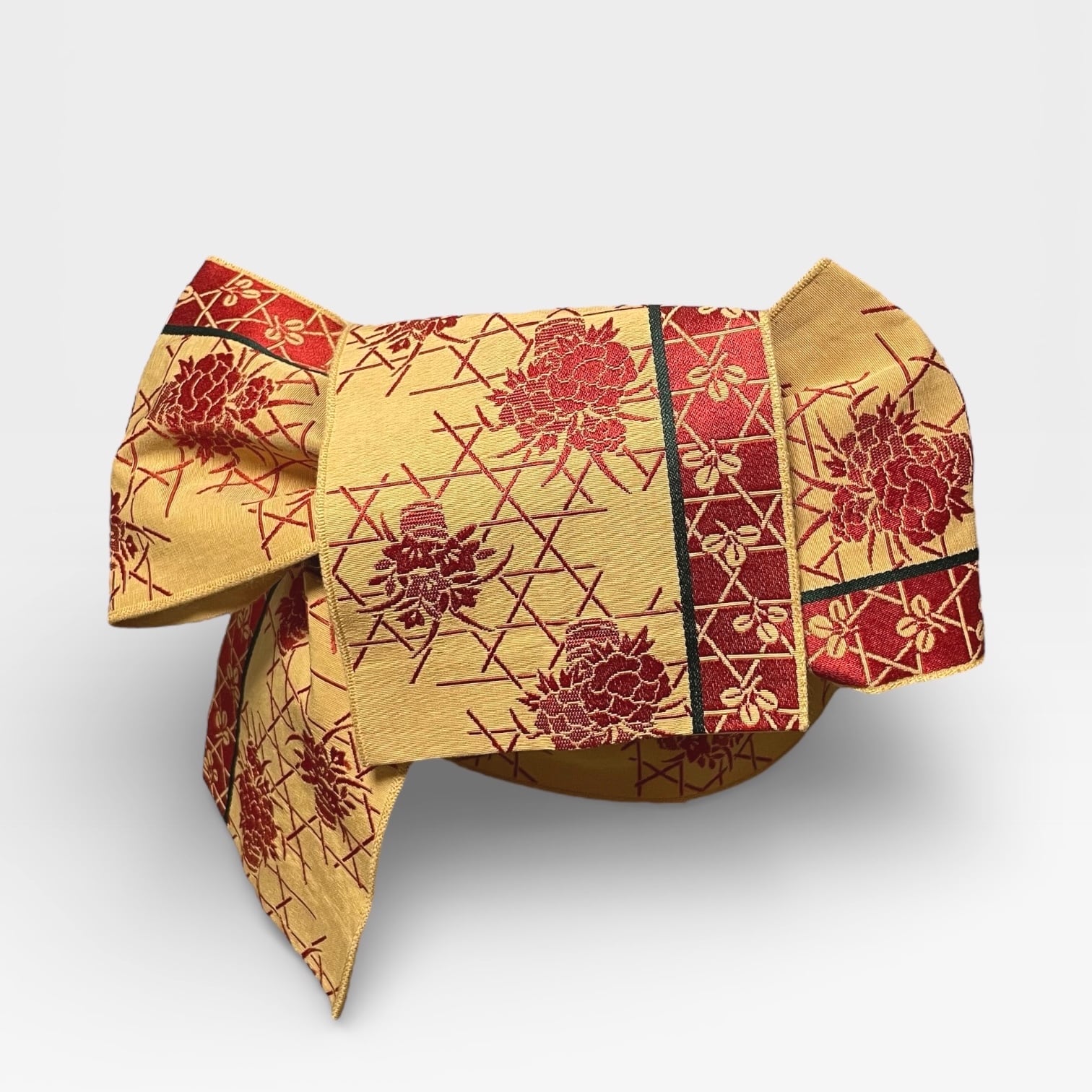 薄橙×赤カラーの桶花模様半幅帯です。胴前を少しずらして巻いても粋で可愛くなる素敵なデザインです。