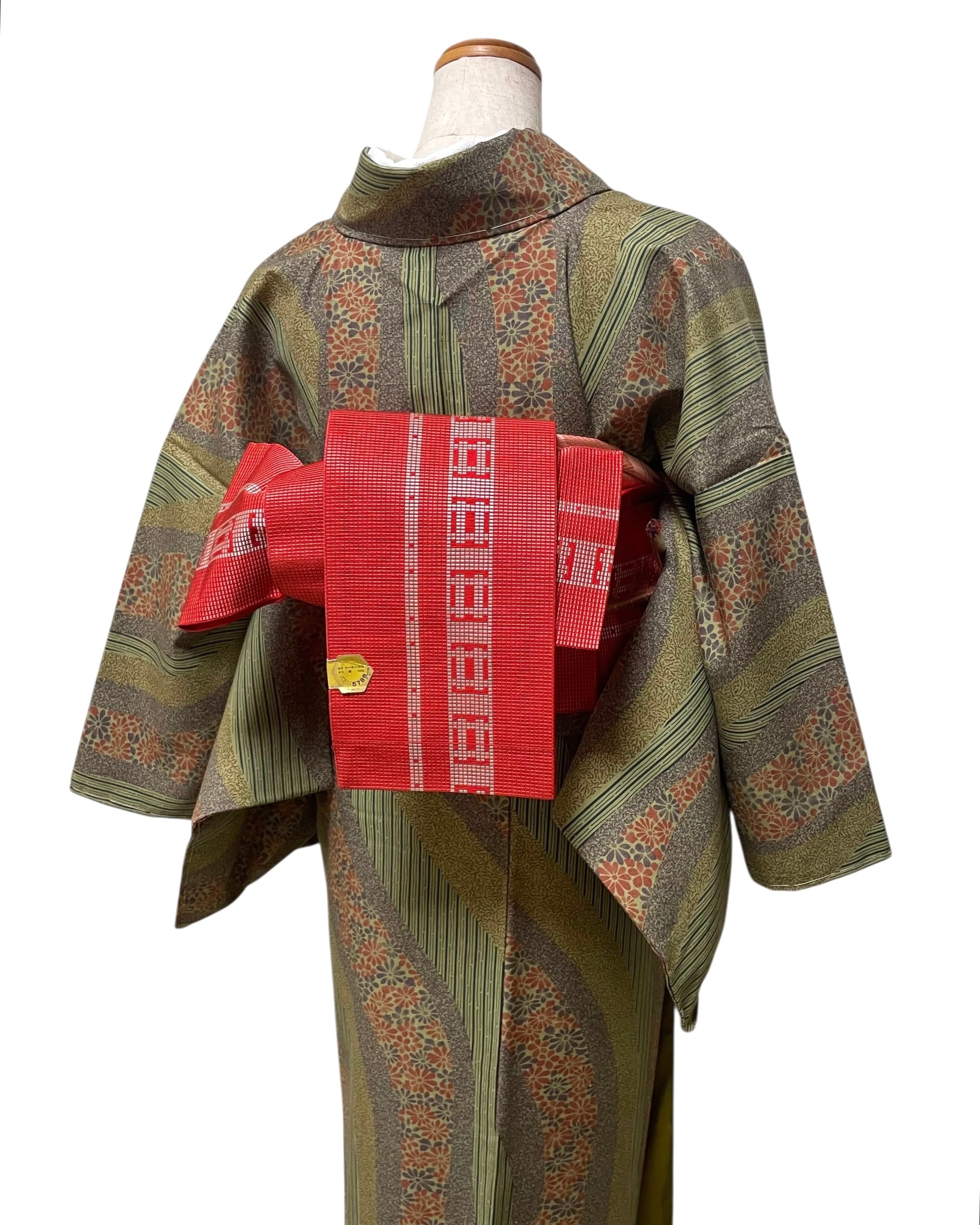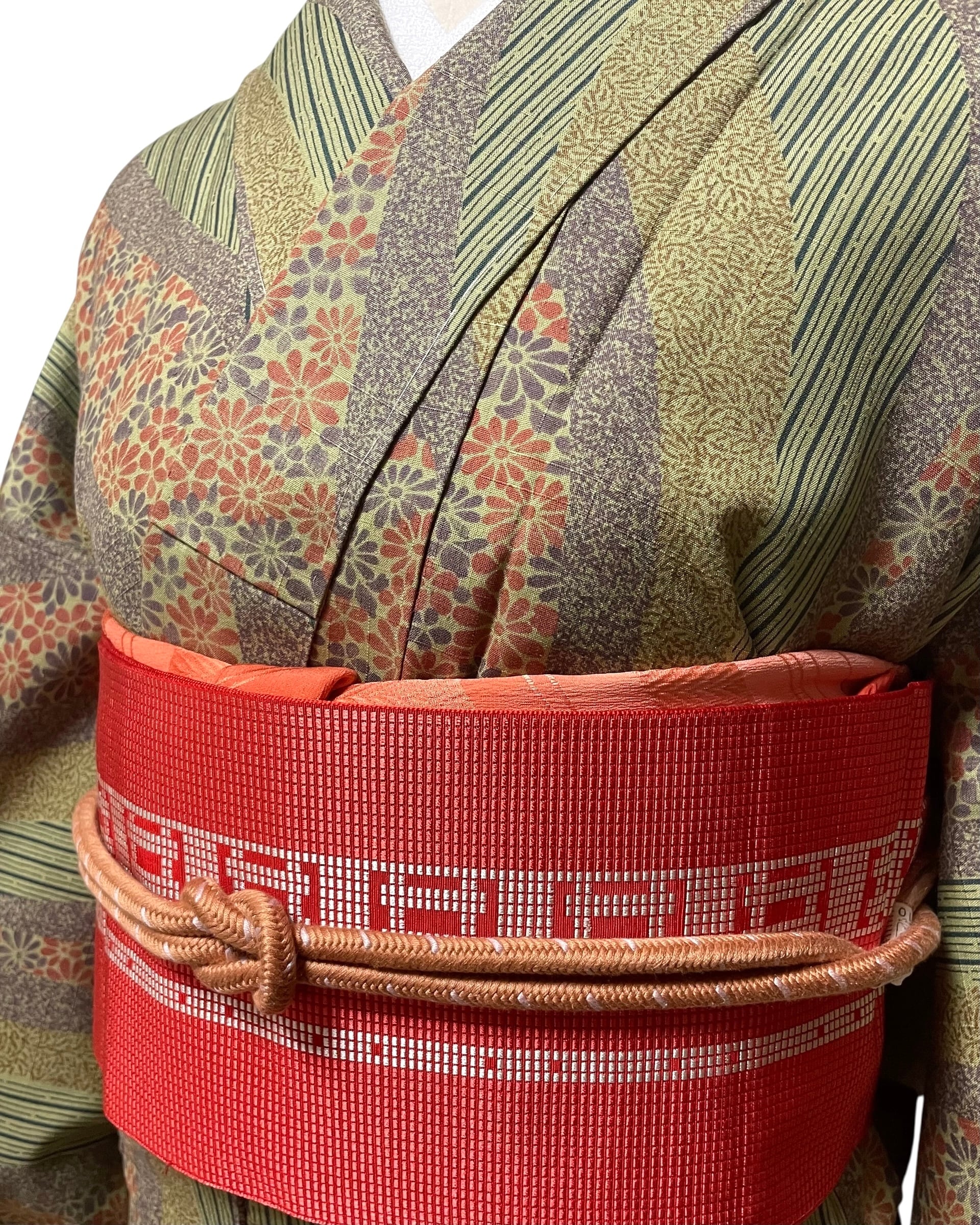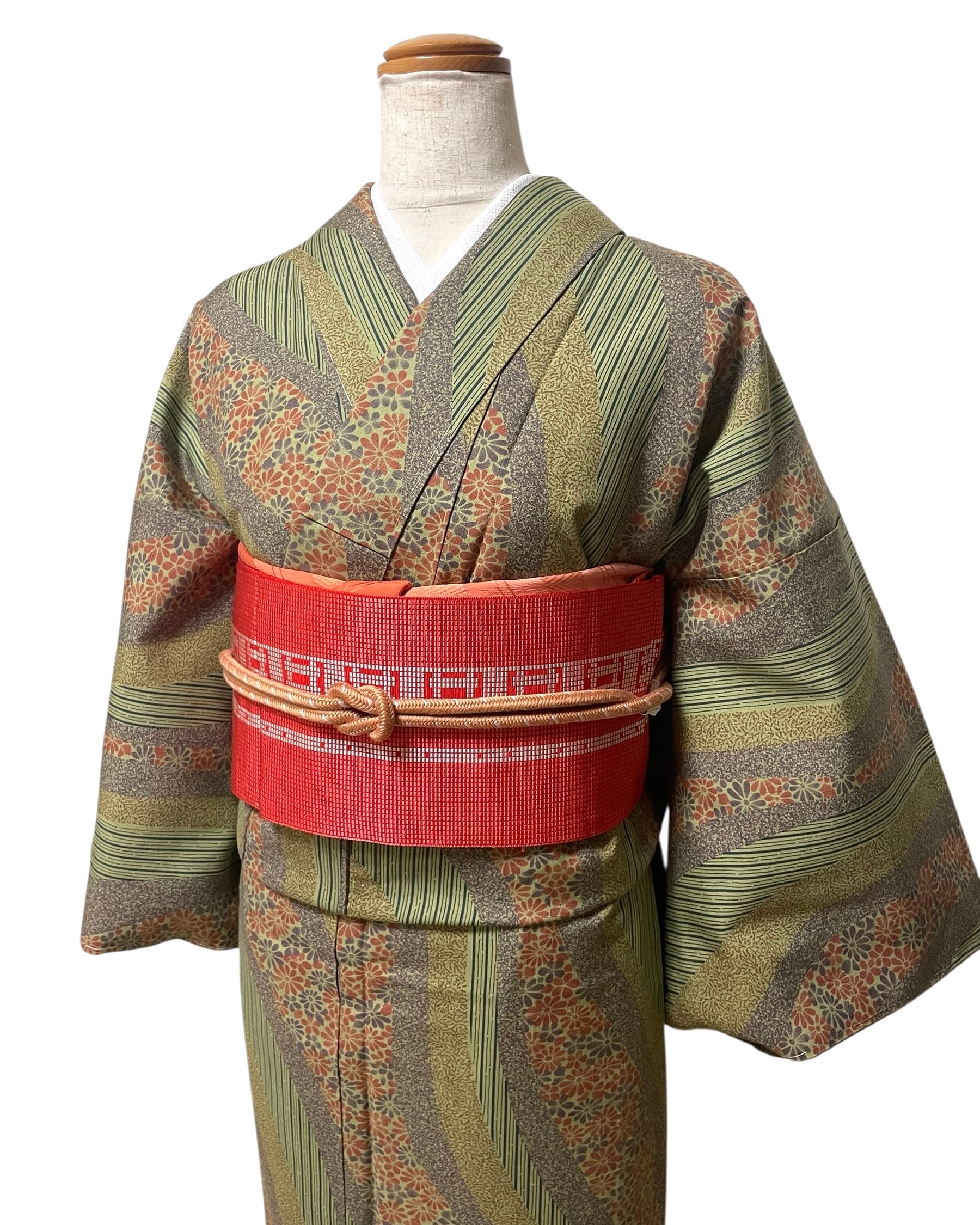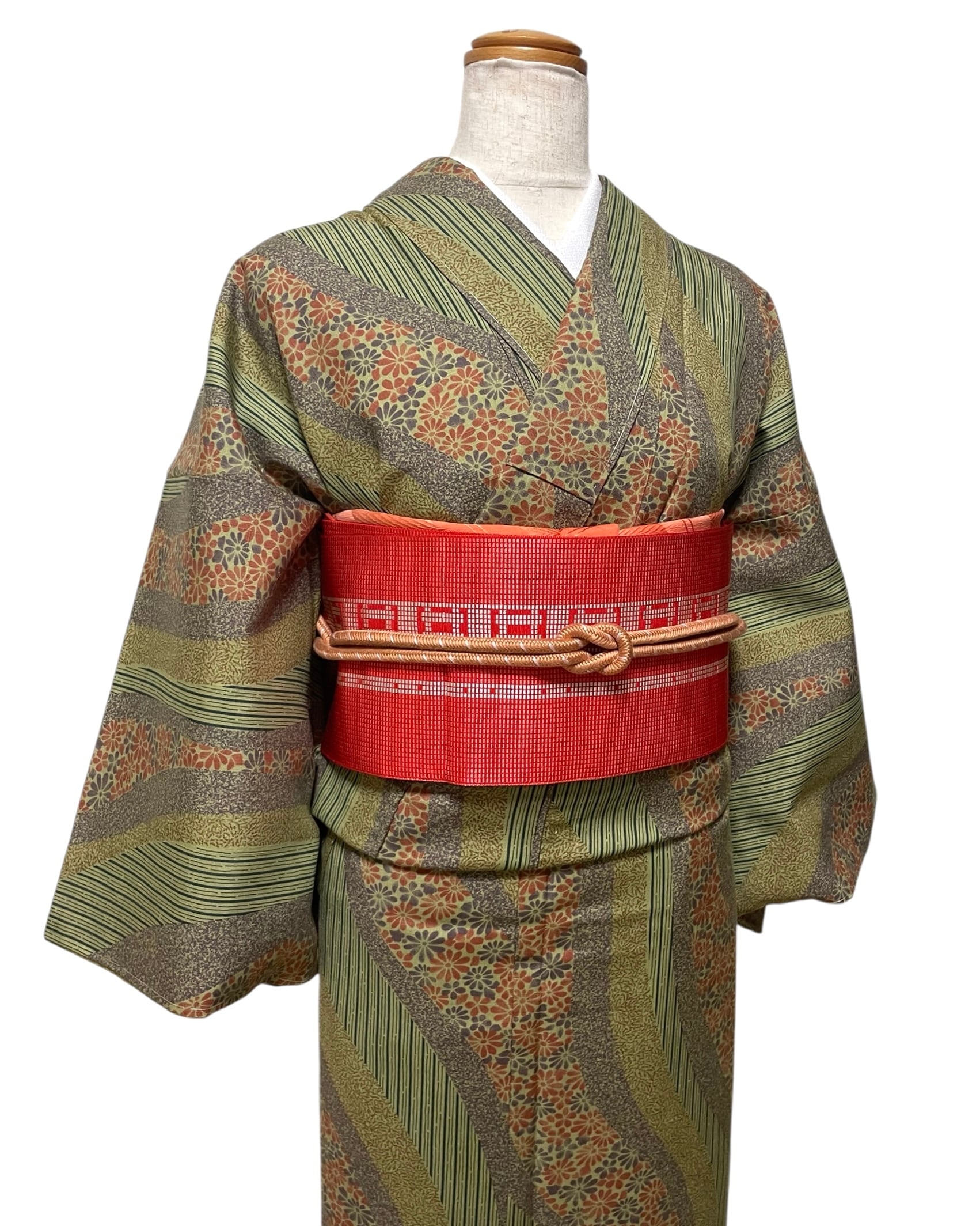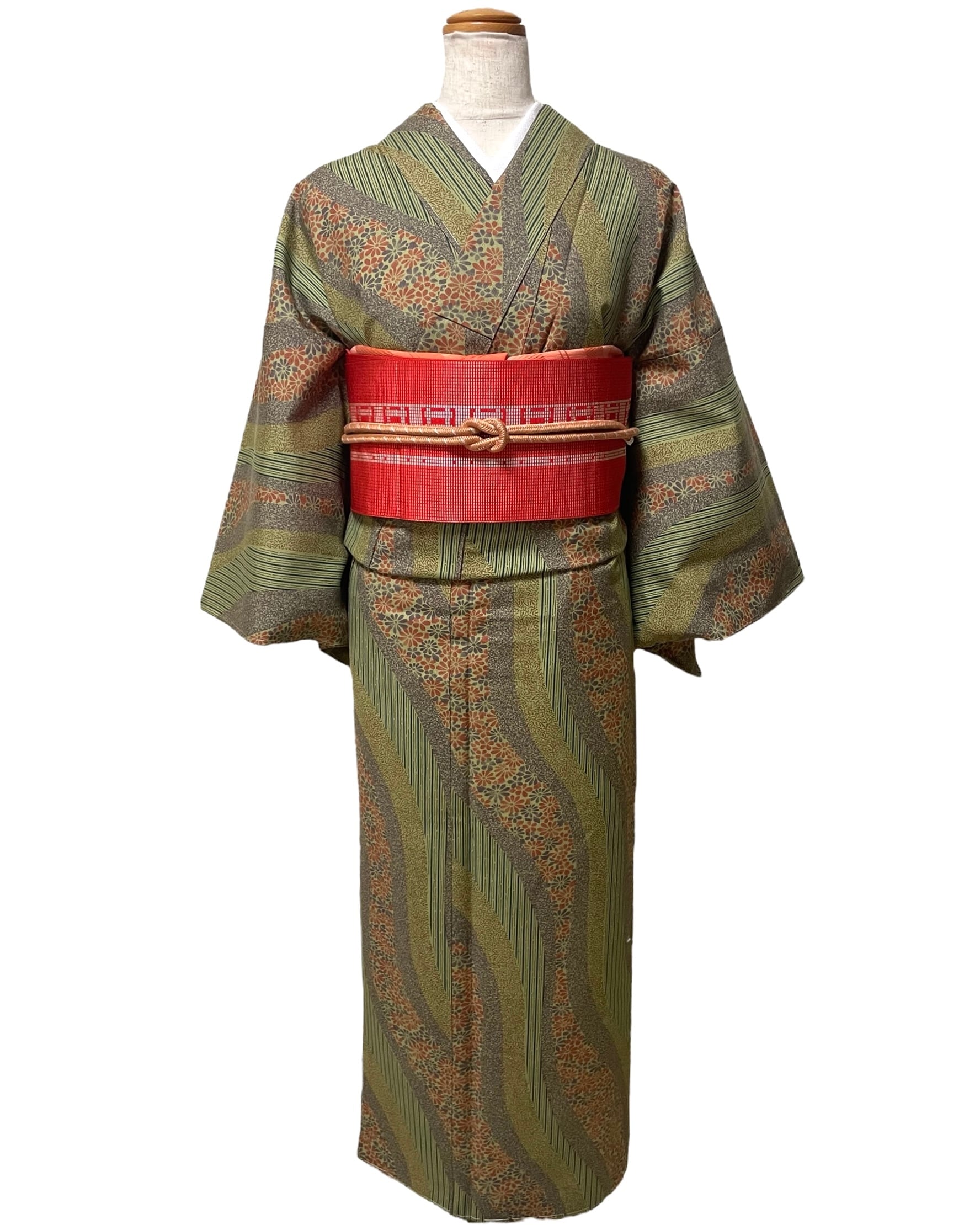 縦縞と花波縞の組み合わせが素敵な模様の袷着物に、橙と朱色を中心に帯と小物を揃えました。落ち着いた色合いの羽織を合わせると大人可愛いコーデとしてまとまります!
