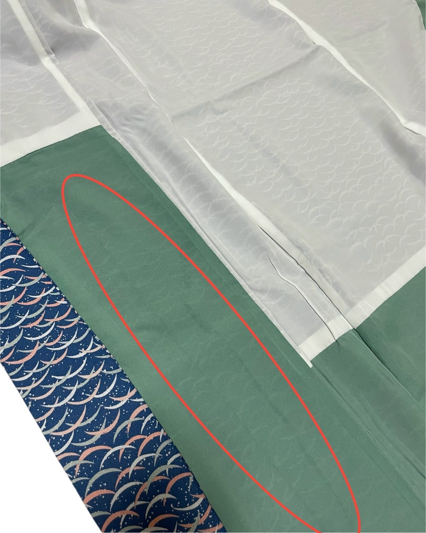 折り畳んで結ぶ時間を短縮したい方のための帯揚げです。三つ折りを更に半分にして端を縫い止めています。真ん中40㎝ほどは縫い止めていないので、枕を入れることもできます。縫い糸をほどくと通常の大きさの帯揚げに戻ります。