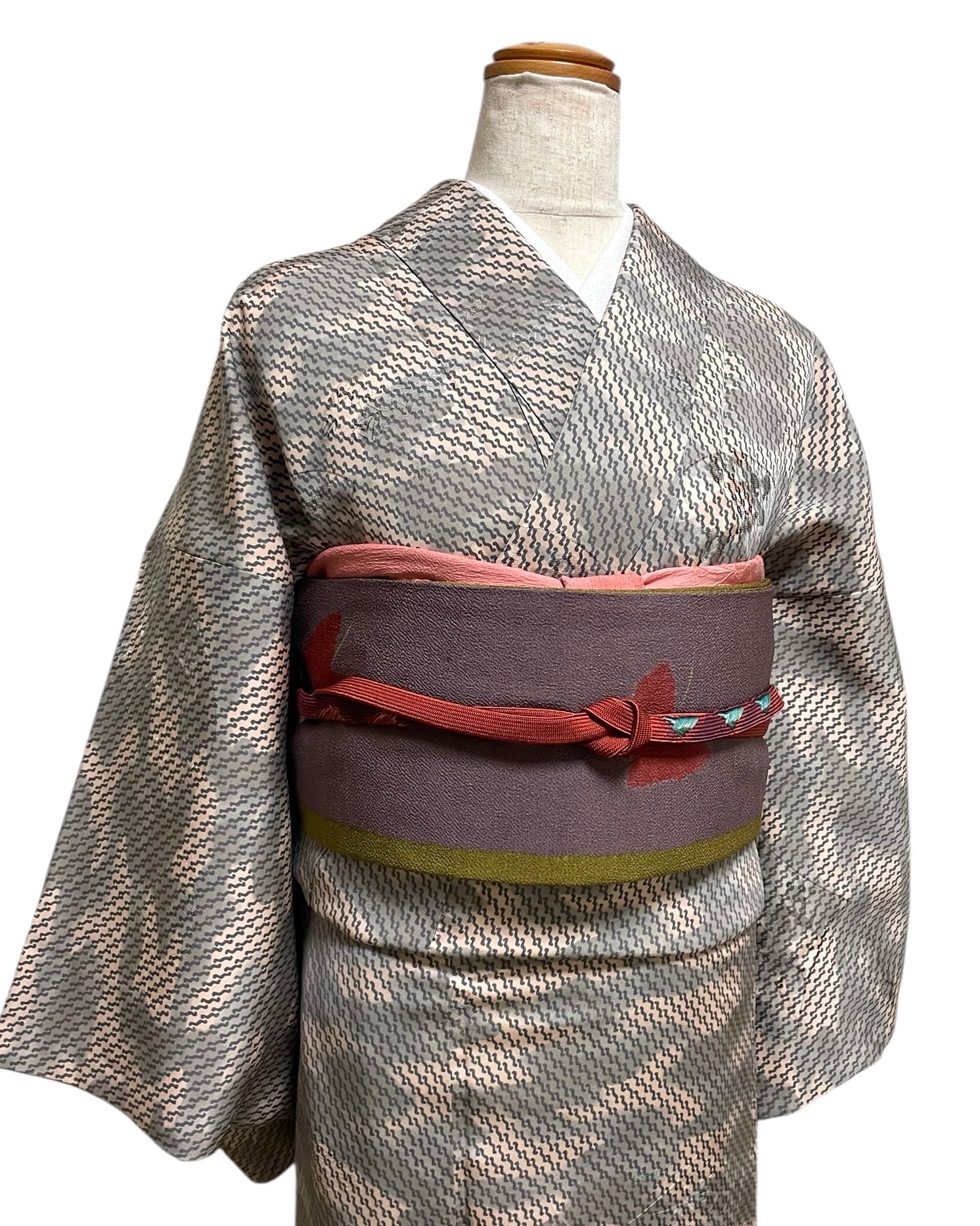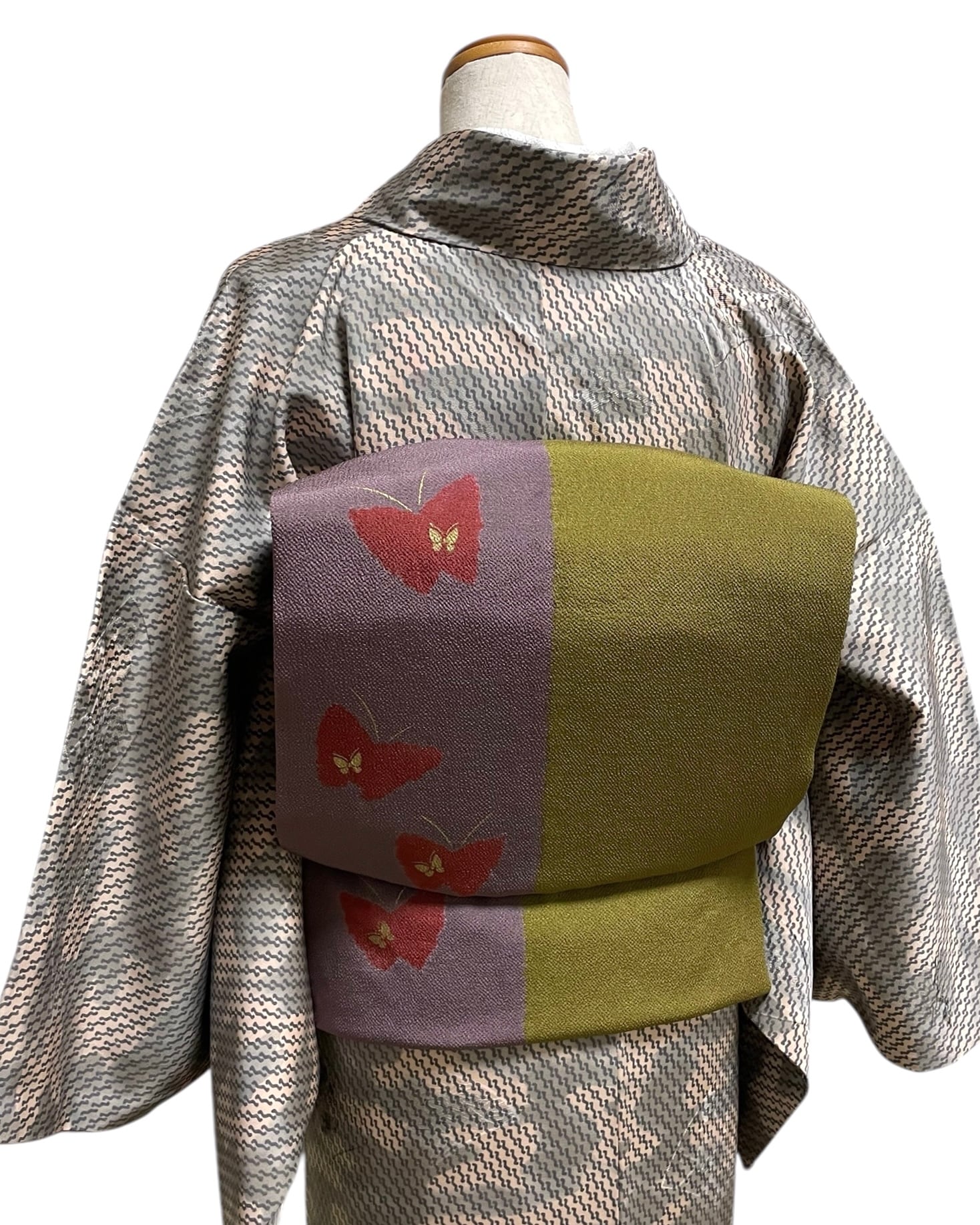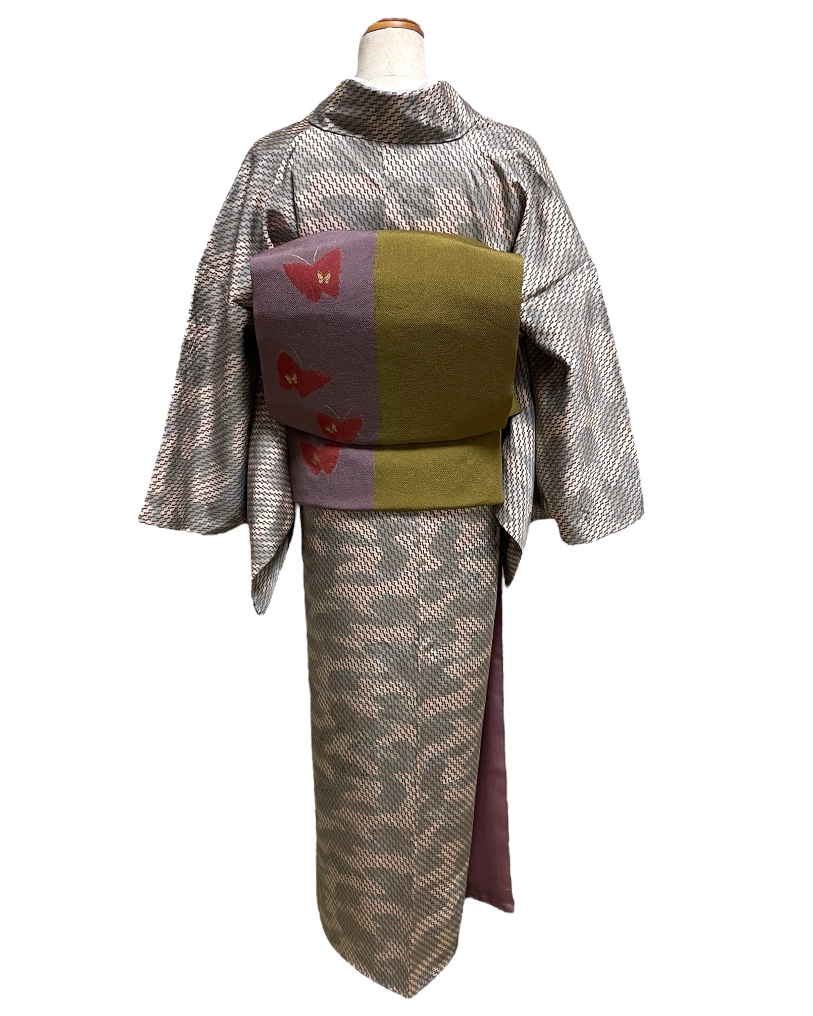 さらりつるりとした絹触りの良い小紋着物に大正ロマンカラーが可愛いカジュアルめな縮緬地の名古屋帯を合わせました。小物は帯の蝶柄の色に揃えています。帯や小物によって綺麗めからカジュアルまで楽しめる万能系の着物なので、色んな系統のコーデを楽しみたい方にもお勧めです。