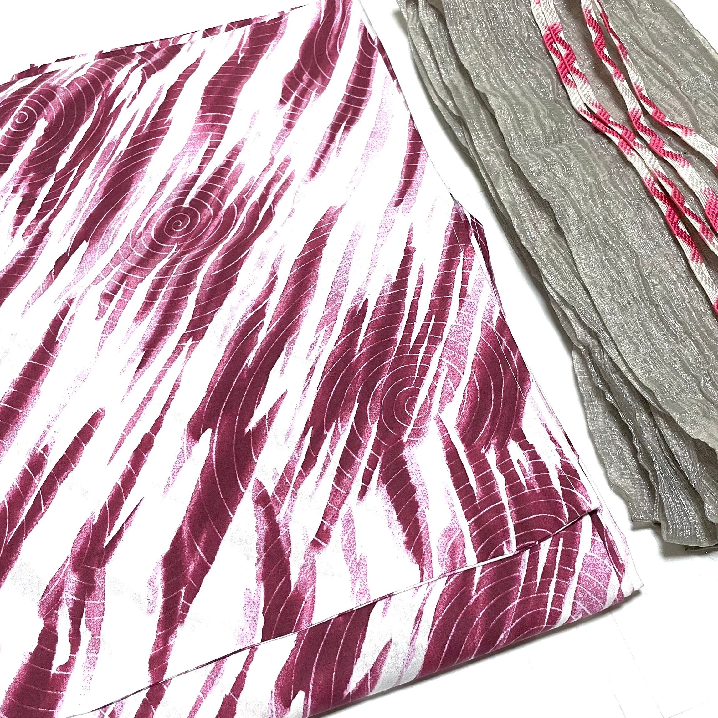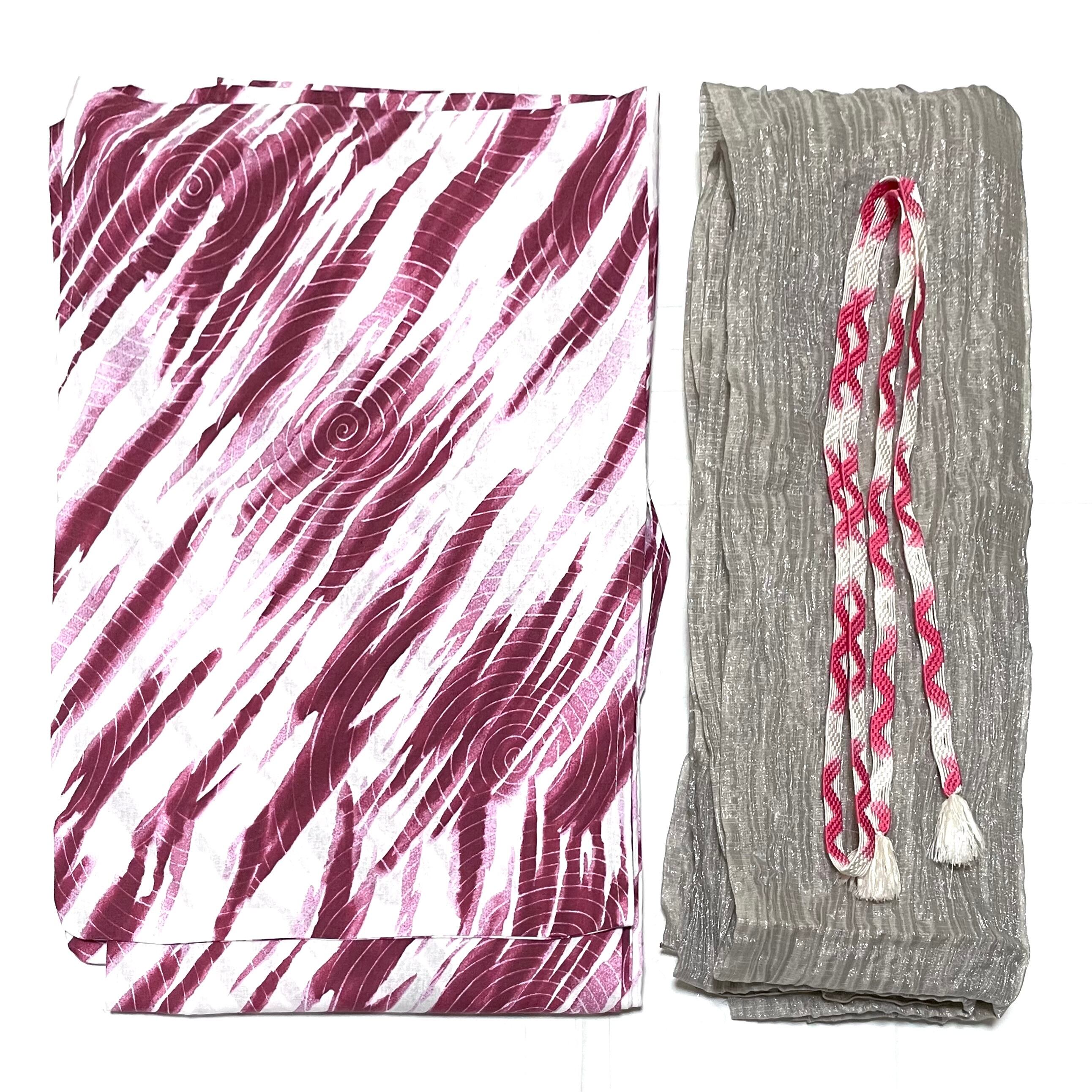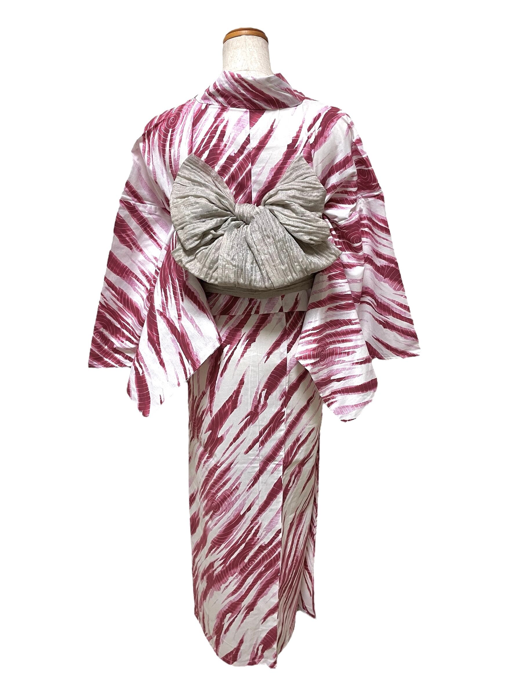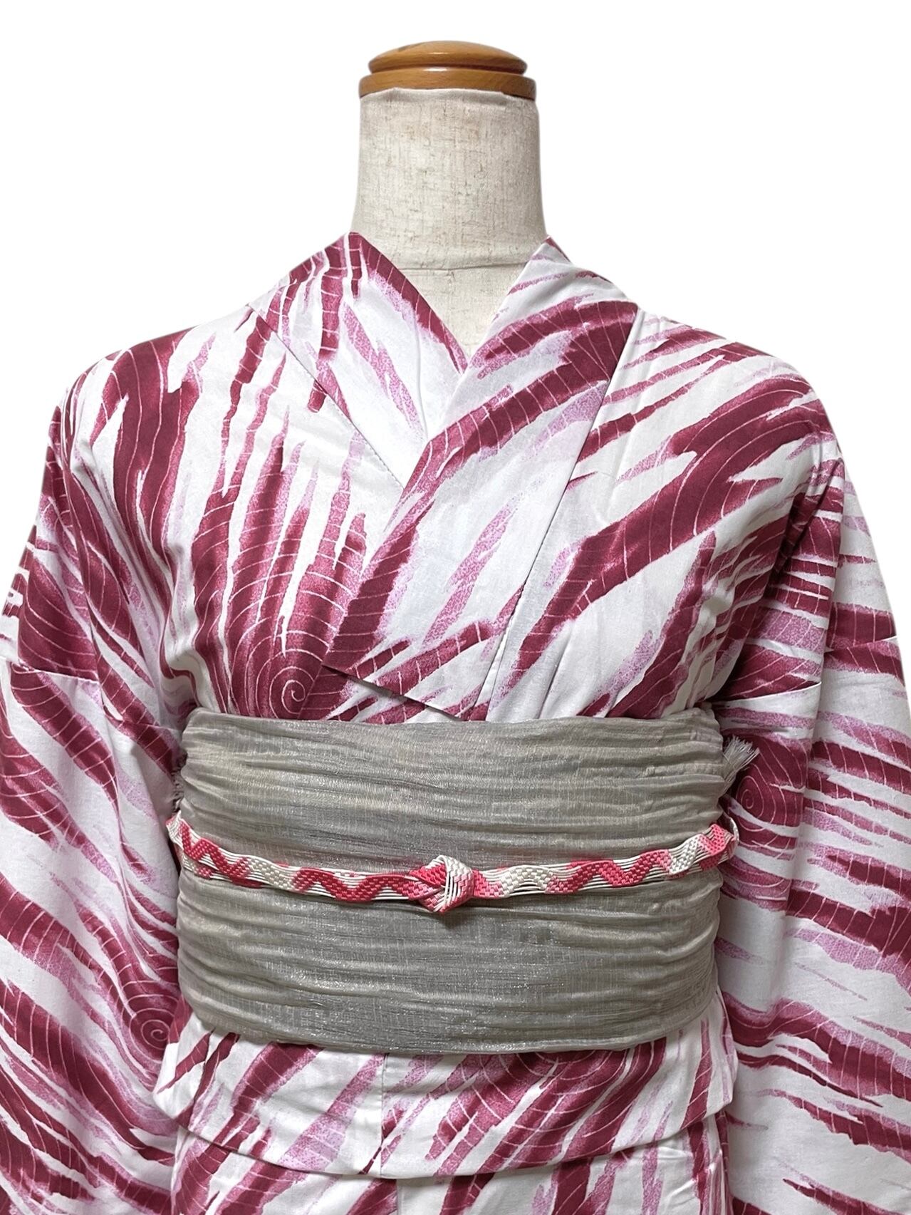 抽象斜め縞と渦柄の浴衣にほんのり赤味のあるラメへこ帯とホワイトピンクの帯締めを合わせました。全体の色合いを赤とピンクでまとめています。柄がシンプルな物を合わせているので大人でも可愛く着こなせる組み合わせです。へこ帯を角出しに結ぶのもお勧めです。